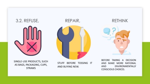 3.2. REFUSE, REPAIR, RETHINK BEFORE TAKING A DECISION SINGLE-USE PRODUCTS, SUCH STUFF BEFORE TOSSING IT AND MAKE MORE RATIONAL AS BAGS, PACKAGING, CUPS, AND ENVIRONMENTALLY STRAWS AND BUYING NEW. CONSCIOUS CHOICES.